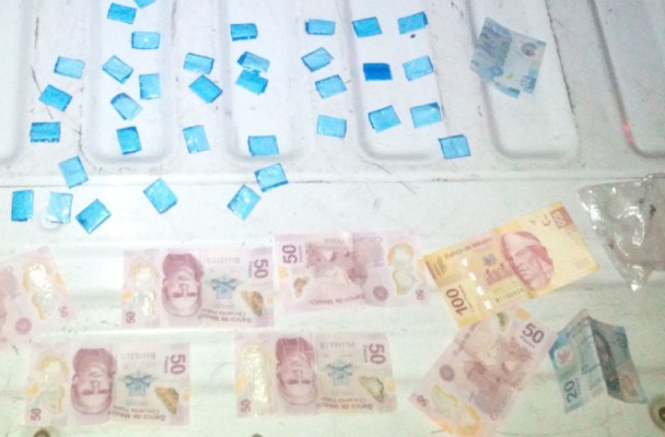 Por dicha actitud, elementos estatales marcaron alto total al conductor de la unidad, pero éste se dio a la fuga, pero fue interceptado metros adelante y durante una revisión corporal se le encontró en la bolsa derecha del pantalón una bolsa de plástico que contenía 35 bolsitas de color azul con polvo blanco.