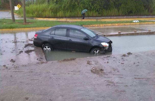 Una obra en construcción fue abandonada por una empresa contratista en el Complejo Cangrejera, sin que pusiera ningún señalamiento de advertencia, por lo que tras los encharcamientos de lluvia un automovilista cayó en esta trampa mortal