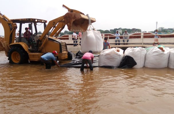 La Comisión Nacional del Agua, el Ayuntamiento de Minatitlán y Protección Civil están instalando bloques de súper-sacos para taponear las inundaciones hacia dentro de la ciudad.
