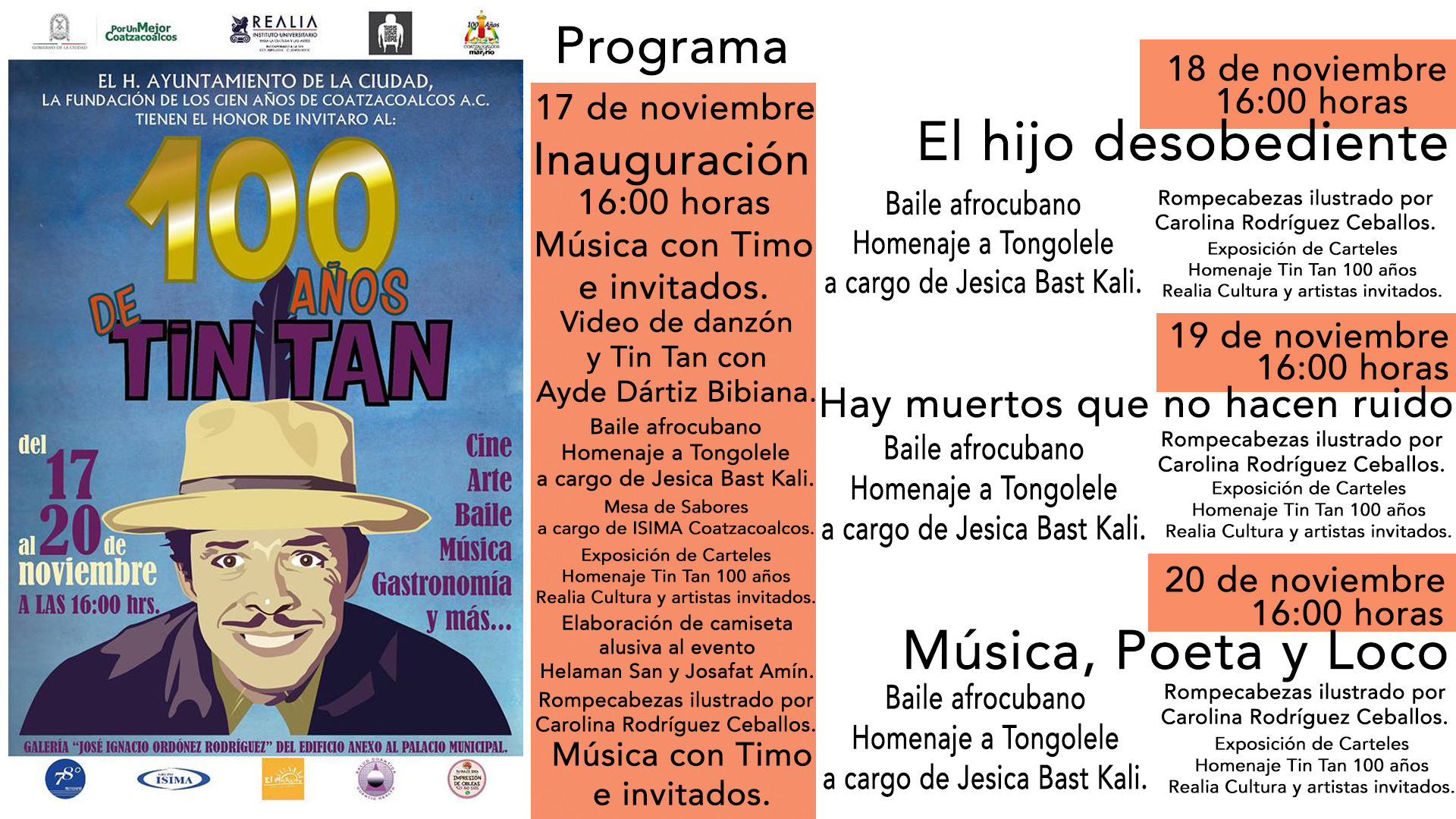 El Instituto de Gastronomía Isima Coatzacoalcos colocará una “Mesa de Sabores”; se instalará una exposición permanente de carteles “Homenaje a Tin Tan 100 años”, por parte del Instituto Universitario para la Cultura y las Artes “Realia”, de Xalapa y artistas invitados.