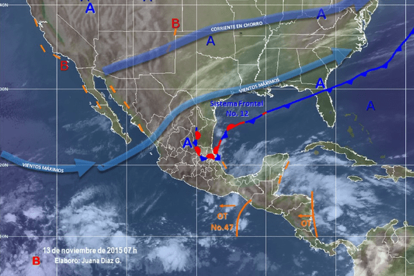 El Frente número 12 se ha estacionado en el norte-centro de Veracruz e interactúa con la Onda Tropical número 47, cuyo eje cruza el Istmo de Tehuantepec. Se espera que el Frente logre llegar al sur de Veracruz esta tarde-noche.