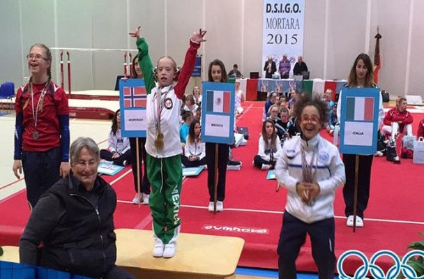 La niña Bibi, deportista practicante de Gimnasia que tiene Síndrome de Down, ganó tres medallas de oro en un Campeonato Mundial en Italia donde representó a México