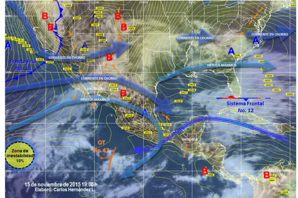El Frente Frío Número 12, que se extiende como estacionario desde el sur de la Península de Florida hasta el oriente del Golfo de México, en interacción con un canal de baja presión localizado en el sureste de México.