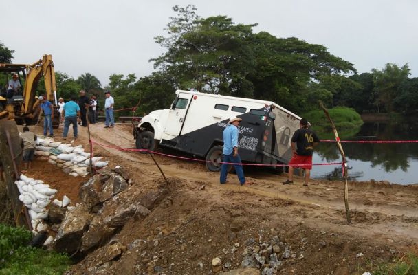 Hidalgotitlán, Ver.- Una camioneta de valores se salió fuera del puente colapsado El Apompal en este municipio de Hidalgotitlán debido a que ni la Secretaría de Infraestructura y Obras Públicas del Gobierno del Estado ni el Ayuntamiento han emprendido acciones para repararlo.