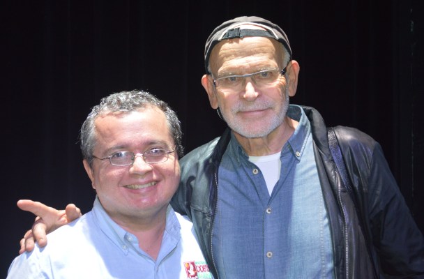 El periodista alemán Günter Wallraff, con el editor de COSTA, Jorge Cáceres; durante una conferencia en la Ciudad de México donde se le entregaron los ejemplares impresos de este medio.