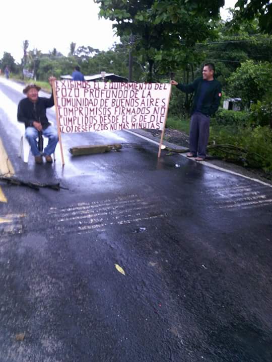 Cosoleacaque, Ver.- A las 8:00 horas de este martes, alrededor de cien habitantes de la comunidad Buenos Aires, perteneciente a Cosoleacaque, bloquearon la carretera Antigua Coatzacoalcos-Minatitlán, a la altura de la comunidad conocida como El Jobo-Chinameca, en demanda al Gobierno Estatal por el incumplimiento del equipamiento del pozo profundo en esta comunidad.