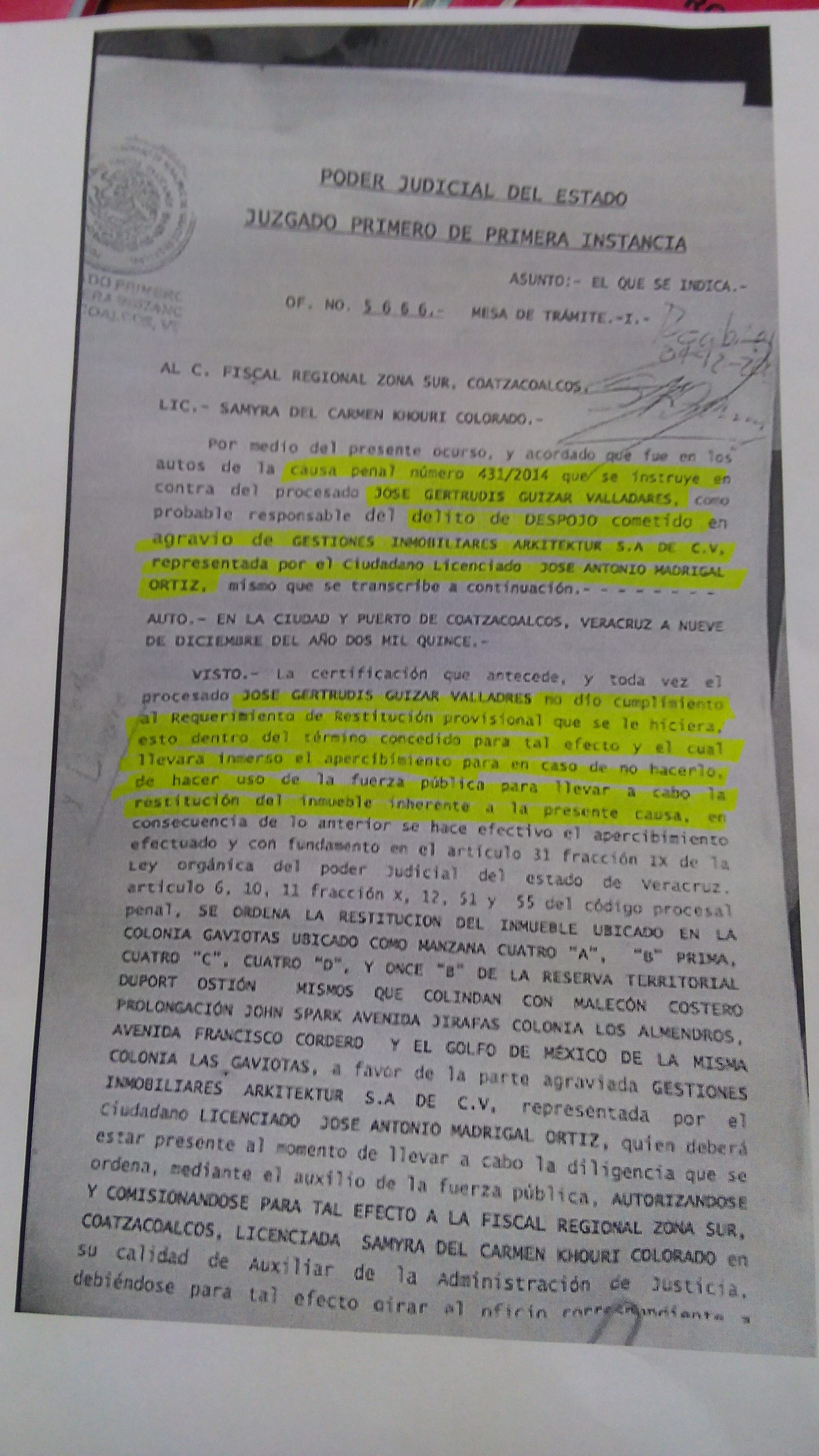 Coatzacoalcos, Ver.- La orden de desalojo para el predio Los Almendros estaba dirigida para Gertrudis Guízar Valladares y no para los posesionarios de Manuel Bringas, afirmó la representación legal de las familias desalojadas, a cargo de la Organización Ciudadanos en Defensa de los Derechos Humanos.
