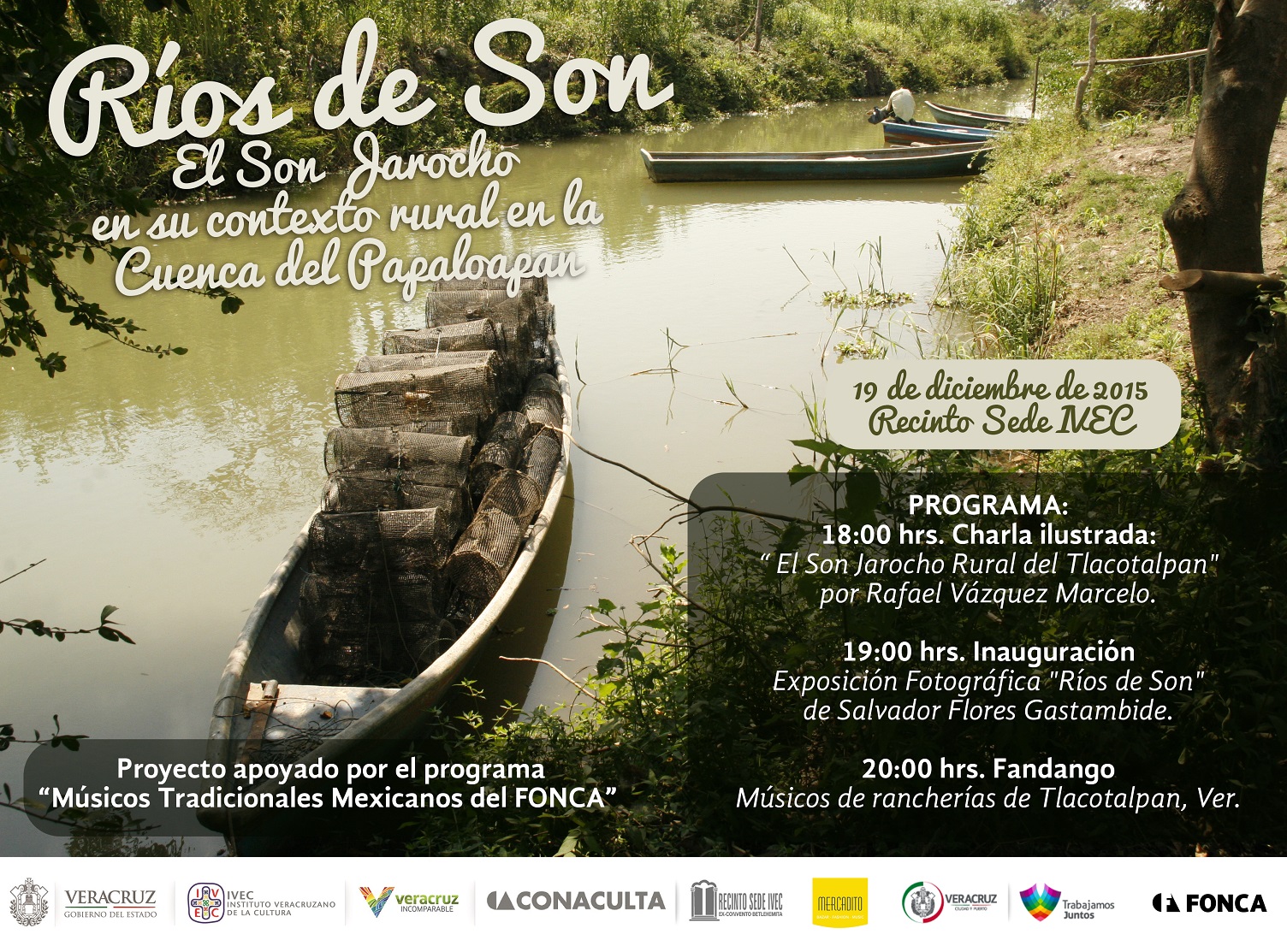 Posteriormente, será la inauguración de la muestra fotográfica Ríos de son, registro documental de Salvador Flores, y concluye con la realización de un fandango veracruzano por los músicos rurales de las poblaciones estudiadas, integrantes del grupo Estanzuela y el taller de Son Jarocho de Manuel Campechano.