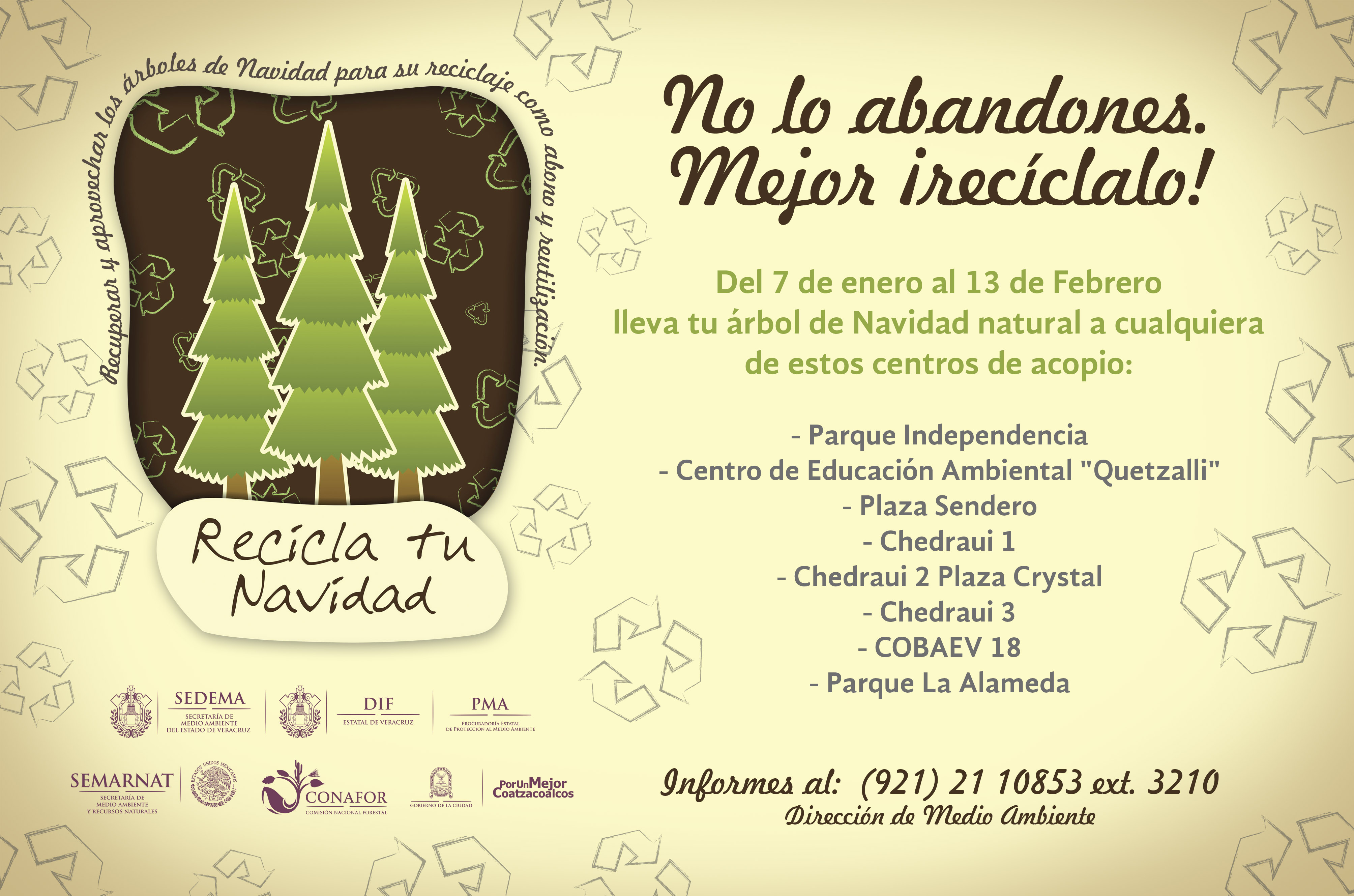 Coatzacoalcos, Ver.- Del 7 de enero al 13 de febrero, se llevará a cabo la campaña “Recicla tu Navidad 2016”, en la cual instalarán siete centros de acopio de recolección de árboles naturales en diferentes puntos de Coatzacoalcos.