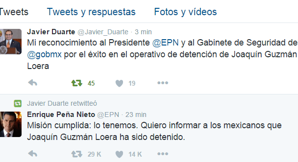 “Misión cumplida: lo tenemos. Quiero informar a los mexicanos que Joaquín Guzmán Loera ha sido detenido”, señaló el mandatario en su cuenta de Twitter.