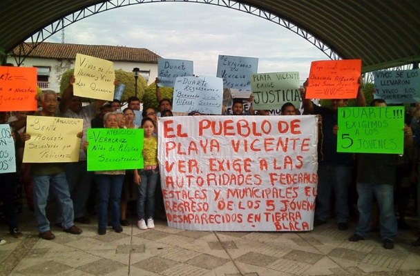 Tierra Blanca, Veracruz.- Este jueves, familias enteras del municipio de Playa Vicente, Veracruz, se alzaron en protesta y activaron movilizaciones para exigir al gobierno del estado la aparición de con vida de los cinco jóvenes secuestrados en Tierra Blanca.