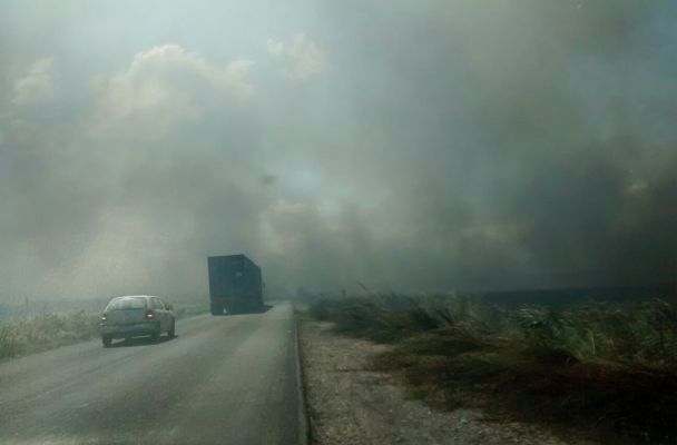 Minatitlán, Ver.- Arde el pantano entre Minatitlán y Coatzacoalcos, ello obligó a Protección Civil a cerrar esta carretera.