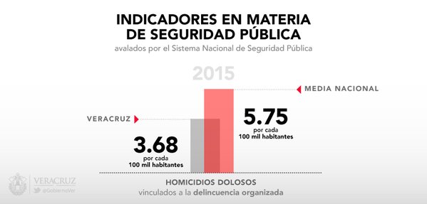 En el caso de los homicidios dolosos vinculados a la delincuencia organizada, durante 2015 Veracruz tuvo una tasa de 3.68 eventos por cada 100 mil habitantes, cifra sensiblemente menor a la media nacional, que es de 5.75 homicidios dolosos de este tipo por cada 100 mil habitantes.