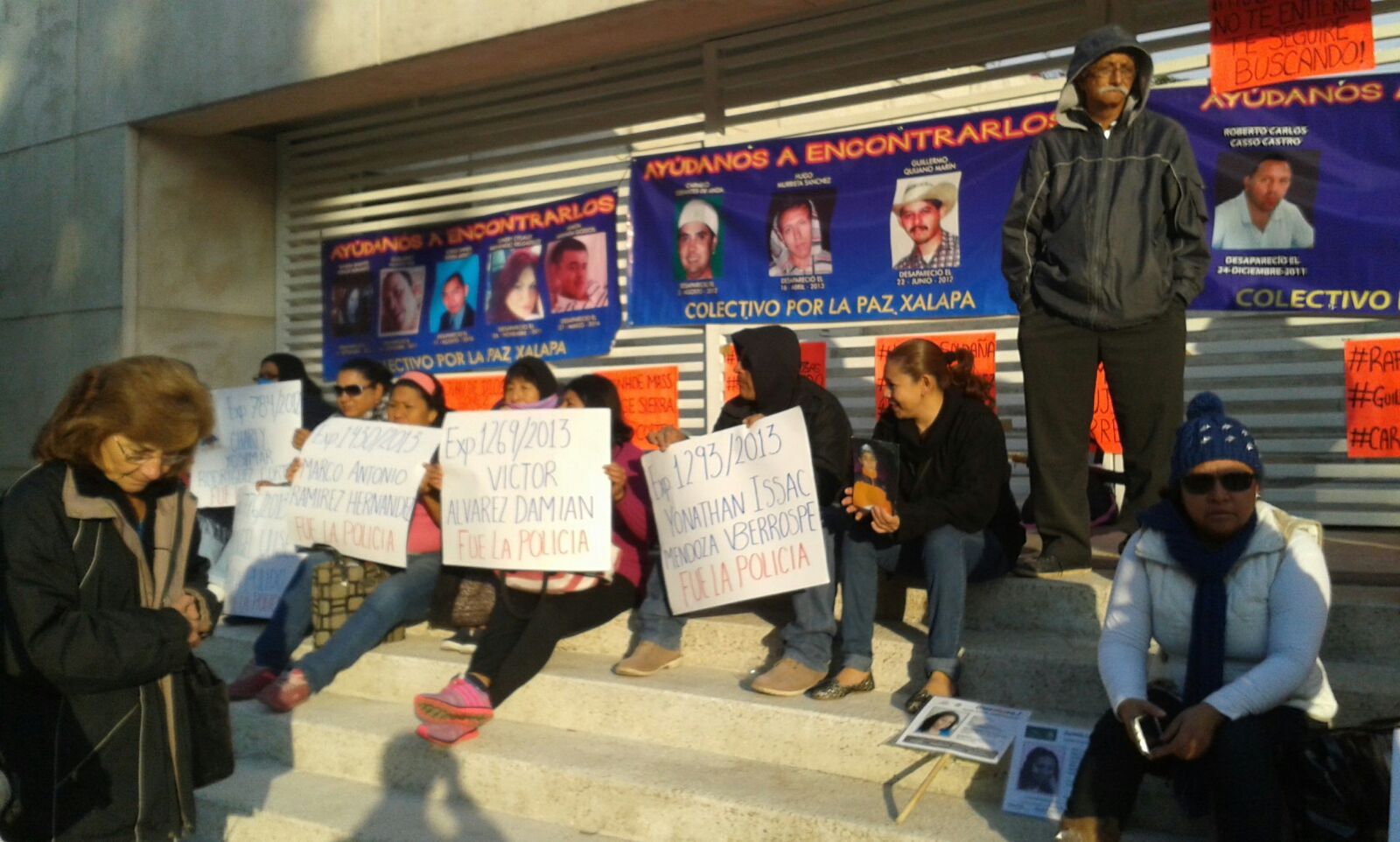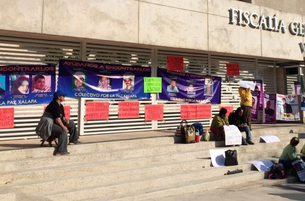 Xalapa, Ver.- Con pancartas y fotografías de los familiares desaparecidos de Tierra Blanca buscan presionar a las autoridades para que les entreguen avances de las investigaciones.