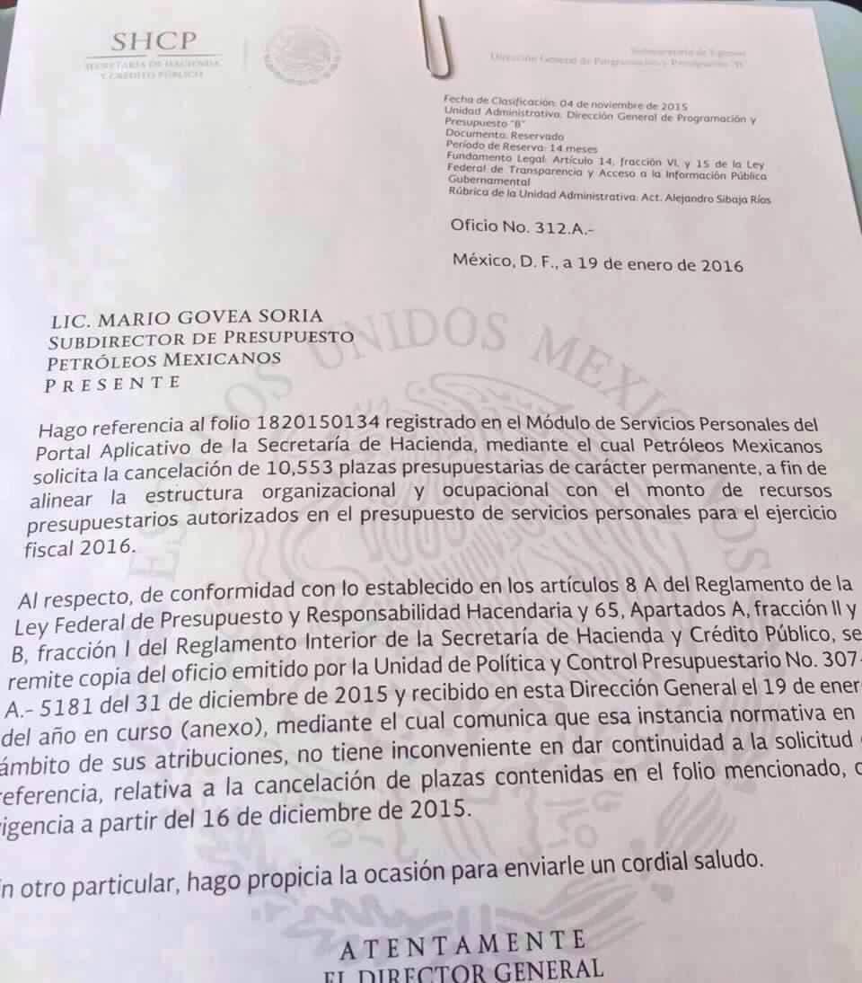 En su primer párrafo el documento señala: Hago referencia al folio 1820150134 registrado en el módulo de servicios personales del portal aplicativo de la Secretaría de Hacienda y Crédito Público, mediante el cual Petróleos Mexicanos solicita la cancelación de 10 mil 553 plazas presupuestarias de carácter permanente, a fin de alinear la estructura organizacional y ocupacional con el monto de recursos presupuestarios autorizados en el presupuesto de servicios personales para el ejercicio fiscal 2016.