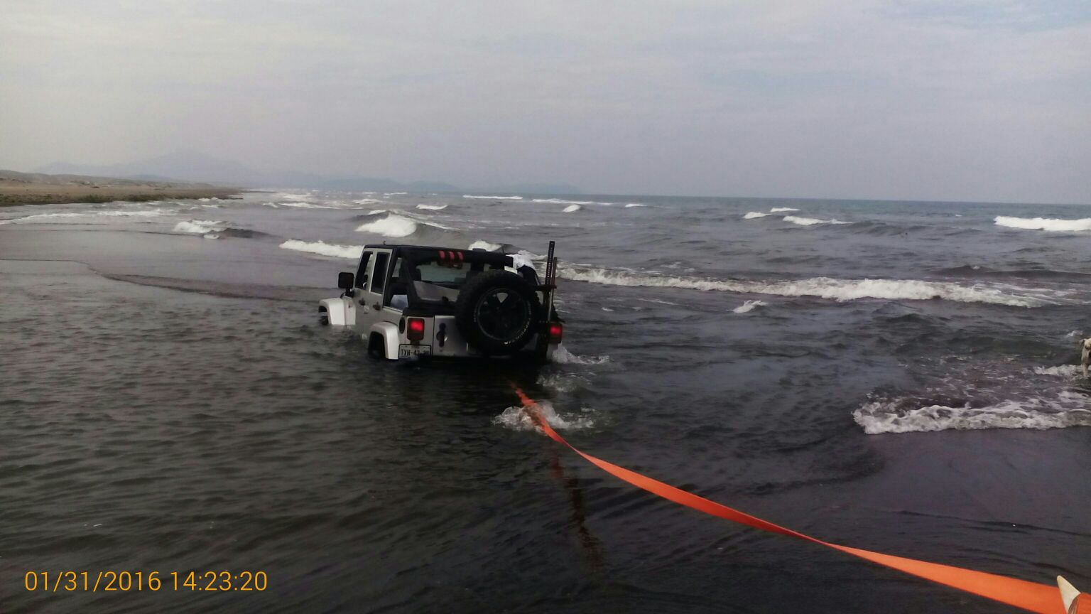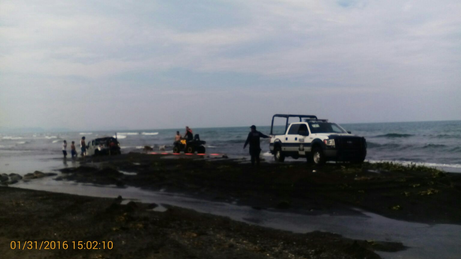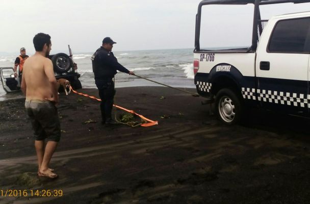 El señor José Cerón Enrique de 42 años de edad, fue auxiliado por patrulleros de la unidad SP-1766 de la comisaría de Seguridad Pública Estatal, con Base en Úrsulo Galván, cuando al tratar de cruzar al otro extremo de la bocana a bordo de una unidad tipo Jeep en color gris, con placas TXN-4333 del estado de Puebla, se atascó produciéndose un hundimiento que podría arrastrar el vehículo mar adentro.