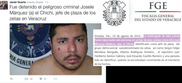 El gobernador informó este martes sobre la detención de «el peligroso criminal Josele Márquez (a) el Chichi, jefe de plaza de los zetas en Veracruz», quien fue reportado hace meses como «ejecutado».