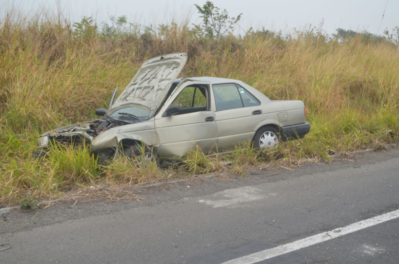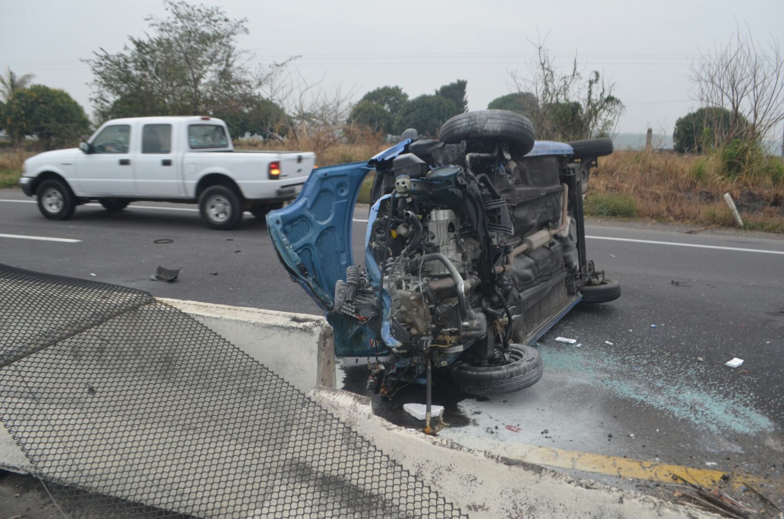 Los bloques de concreto quedaron sobre el carril de alta velocidad en sentido hacia la capital del estado, fue ahí que el conductor de un automóvil Nissan Tsuru en color arena, con matrícula para circular YHJ-21-58, colisionó contra ellos quedando atrapado entre los fierros retorcidos.
