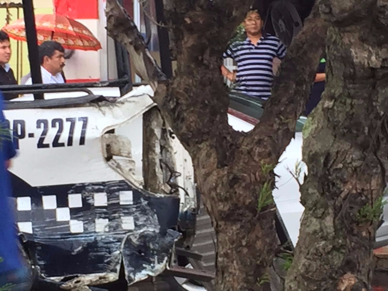 Sin embargo al llegar a la altura de la esquina con Quevedo, la patrulla fue impactada en su parte frontal izquierda trasera por un taxi Nissan, tipo Tsuru, color rojo y blanco, placas de circulación 3485XCY.