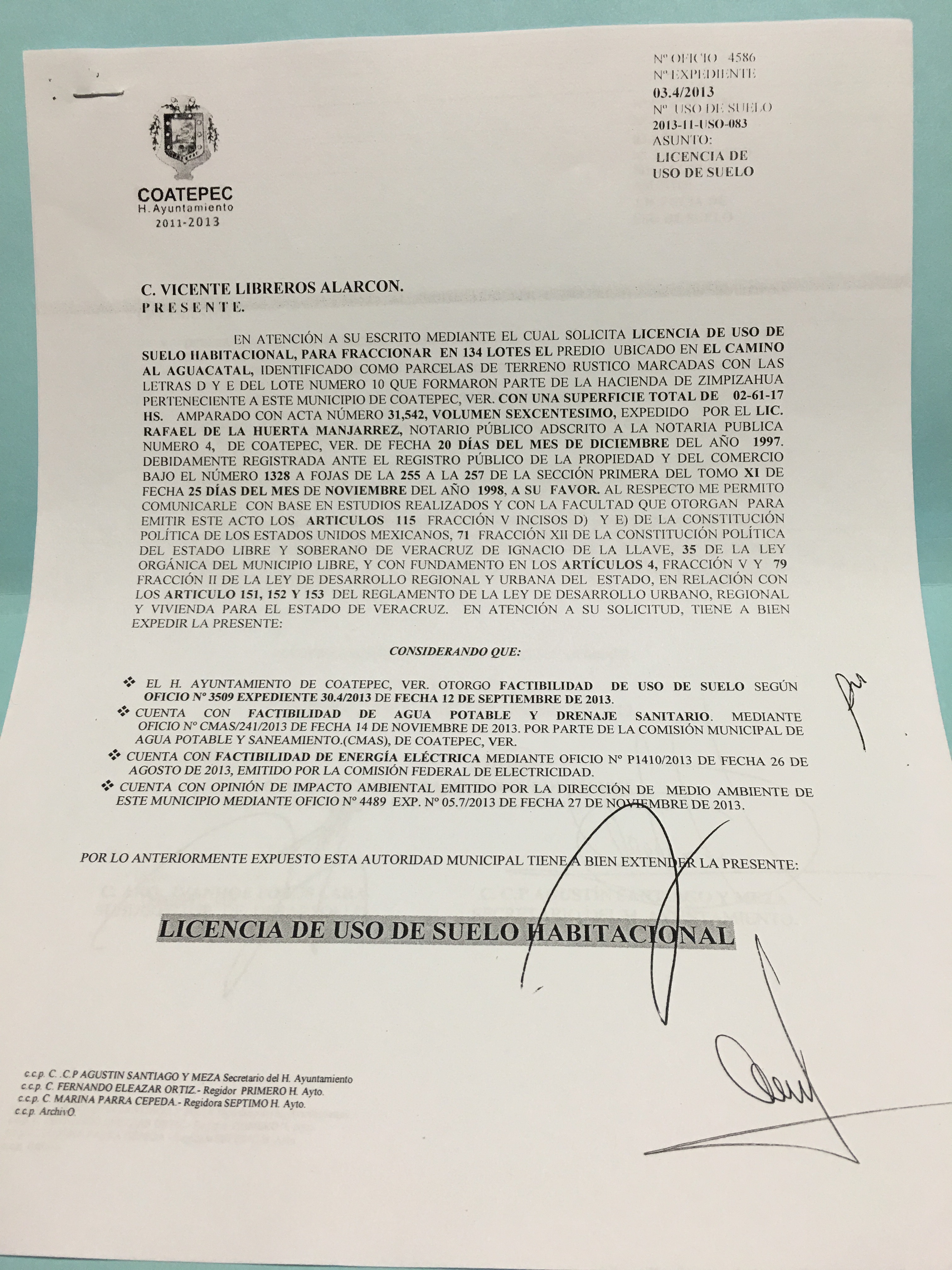 De igual manera mostró una licencia de uso de suelo habitacional expedido el 29 de noviembre de 2013 por parte del ayuntamiento de Coatepec, en oficio número 4586 y firmado el director de Obras Públicas, Salvador Tamborrel Rodríguez, así como por el subdirector de Desarrollo Urbano, Ivanhoe Pozos Lara, y el secretario del Ayuntamiento, Agustín Santiago y Meza.