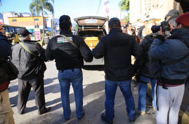Policías vigilan los restos humanos de quien fuera una reportera policiaca veracruzana.