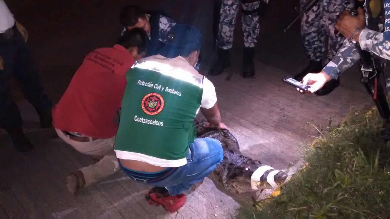 Coatzacoalcos, Ver.- Un enorme cocodrilo de aproximadamente dos metros de largo fue capturado anoche, en el momento que merodeaba por el boulevard a los complejos petroquímicos.