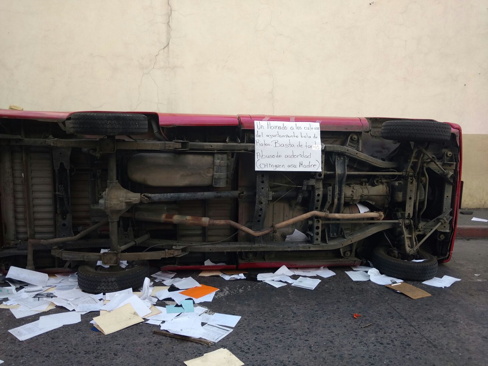 Vuelcan camioneta de comercio para exigir libertad de un vendedor arrestado