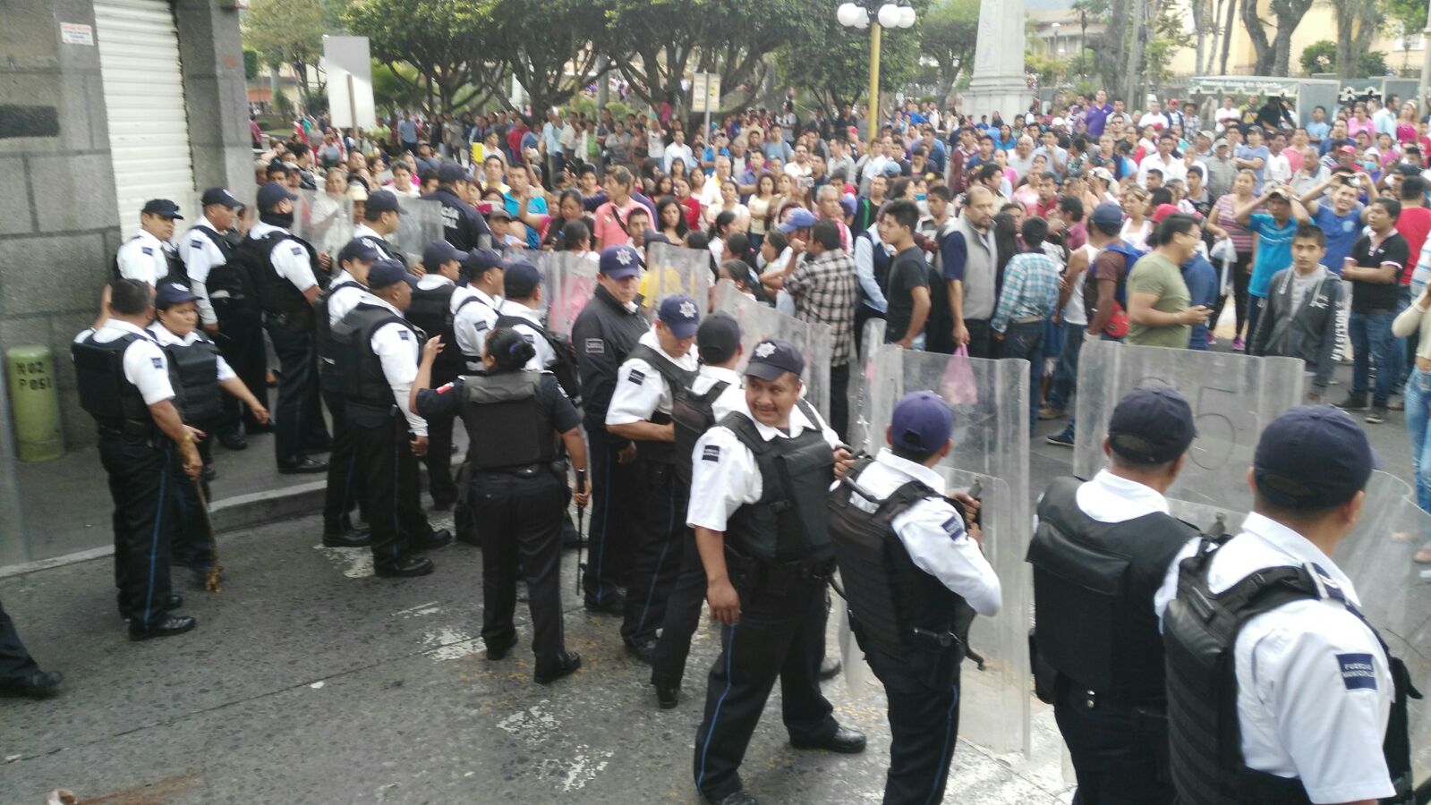 Orizaba, Ver.- Un enfrentamiento entre policías y comerciantes se registra esta tarde en el parque Apolinar Castillo debido a que la autoridad municipal no permite la venta de ningún producto en el primer cuadro de la ciudad.
