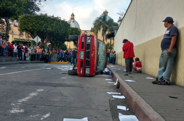 Enardecidos, los vendedores ambulantes arremetieron contra los policías y volcaron una camioneta de la coordinación de Comercio, color rojo marca Nissan placas XU84 192 del estado de Veracruz.
