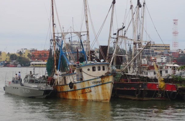Un buque de guerra de la Secretaría de Marina y la Policía Federal mantienen retenido un barco tipo camaronero que está atracado en muelles de Villa Allende de Coatzacoalcos.