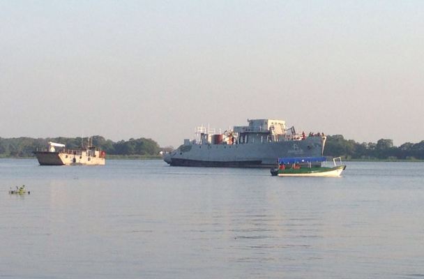 El barco dragaminas-que combatió en la Segunda Guerra Mundial-estuvo varado en el punto del Río Calzadas y Río Coatzacoalcos, por varias horas ya que las maniobras de arrastre no le permitían avanzar por el canal de navegación a pesar de haber cruzado ya debajo del puente.