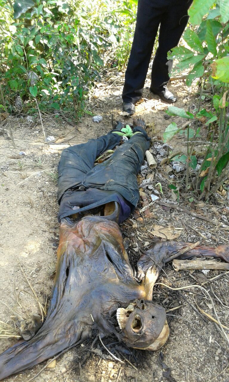 Bajo los rayos del sol que ya comenzaban a sentirse a esa hora, el caporal bajó por el boscoso terreno, quería llegar hasta un pequeño arroyo que pasa en la parte más baja del área, cuando repentinamente le llegó un olor nauseabundo, no le tomó mucha importancia al pensar que quizá se trataba de algún animal muerto, caminó unos 50 metros cuando de pronto se encontró con la grotesca escena.
