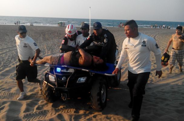 Inmediatamente, un elemento de policía turística, se introdujo 15 metros hacia el mar y gracias al entrenamiento en salva guarda de personas en este tipo de situación, logró llegar hasta la mujer y llevarla con vida hasta la orilla de la playa.