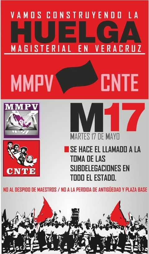 Nosotros como Movimiento Magisterial Popular Veracruzano MMPV estamos accionando también en el estado de Veracruz, con las tomas de las delegaciones de la SEV a nivel estado, para apoyar el paro que nivel nacional están haciendo nuestros compañeros, ir abonando poco a poco para huelga nacional».