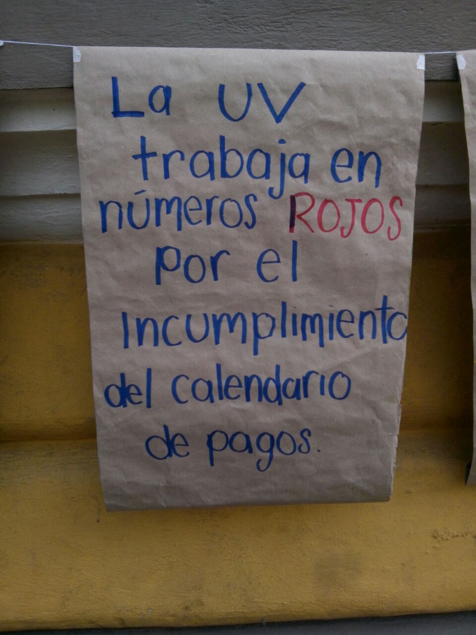 Lonas con leyendas destacando el reclamo de pago al gobierno estatal, la música destacada en la manifestación a ritmo de la Orquesta Mocovita “La UV no se toca” corearon “Todos somos UV” por varias horas a pleno rayo de sol de 35 grados.