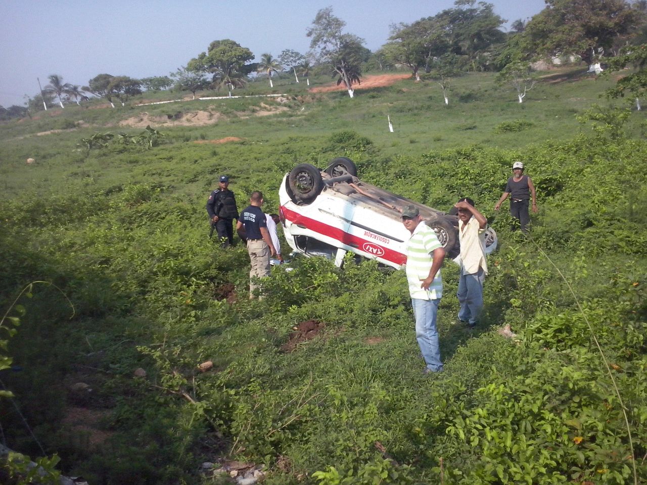 La primera atención de los paramédicos se llevó a cabo la mañana de este sábado, cuando les reportaron un accidente automovilístico en la carretera Antigua a Mina, a la altura del kilómetro 14, donde participó un vehículo, marca Hyunday, tipo i10, con colores oficiales de taxi, el cual se salió de la cinta asfáltica porque el conductor perdió el control de la unidad, quedando ésta totalmente volcada.