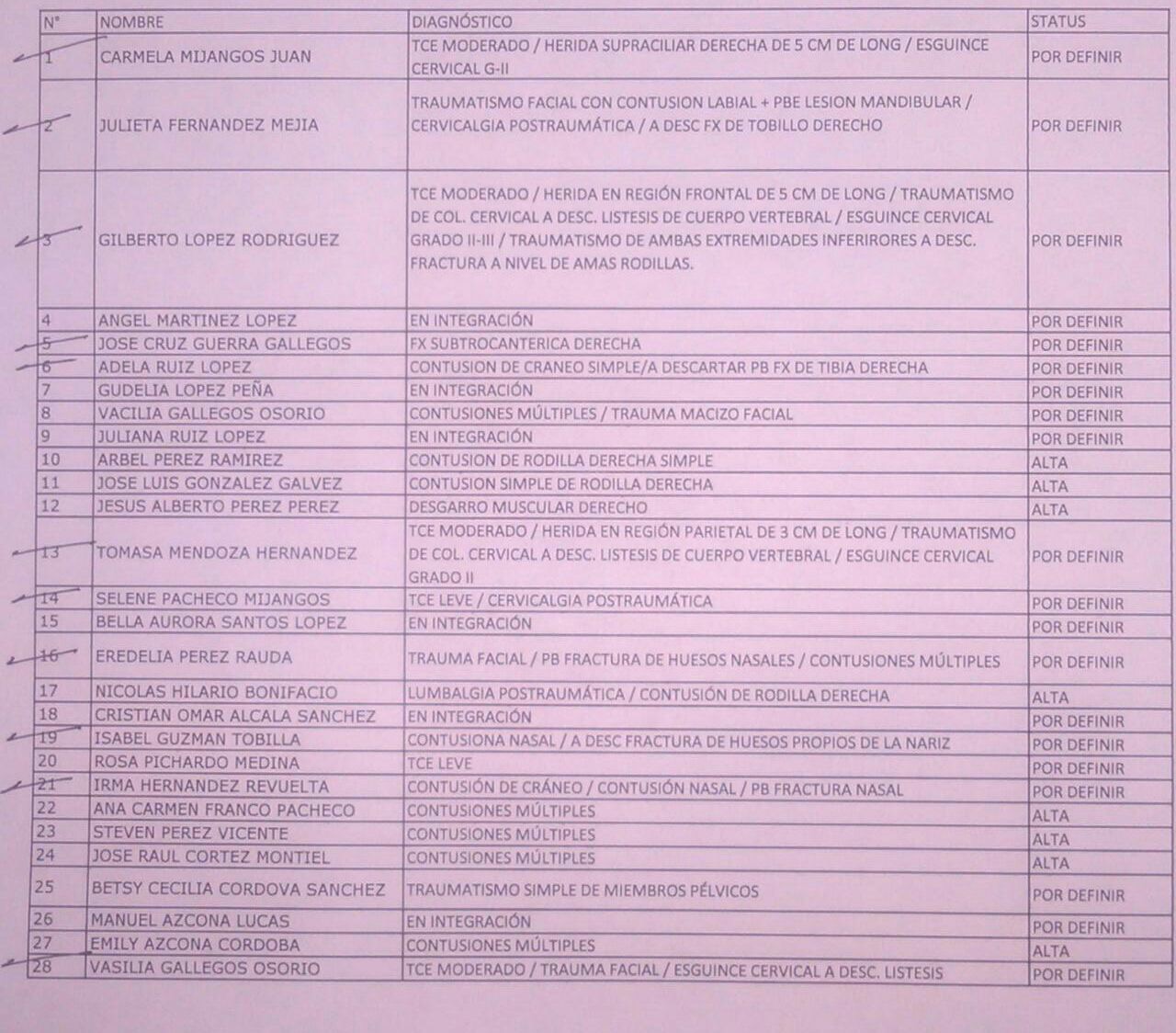 Tras el impacto, resultaron lesionadas 25 personas que tuvieron que ser trasladadas de urgencia al Hospital Covadonga para su valoración; los heridos fueron llevados a bordo de ambulancias de Capufe, Cruz Roja y Bomberos Córdoba, Protección Civil Regional, taxis.