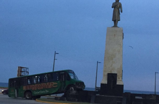 Un camión de pasajeros de la línea Quetzalcóatl terminó estampado contra el monumento a Miguel Hidalgo ubicado en la glorieta de las avenidas Carranza y John Spark en el malecón de Coatzacoalcos.Lo anterior se suscitó la madrugada de este martes luego de que el conductor de la unidad se quedara dormido y terminará sobre las bases de la efigie.