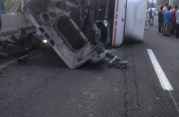 Maltrata, Ver.- El exceso de velocidad y la falta de pericia del conductor de un trailer, provocó que la pesada unidad volcara sobre su costado, accidente registrado en el kilómetro 250 en el tramo de Balastrera en el carril de subida.