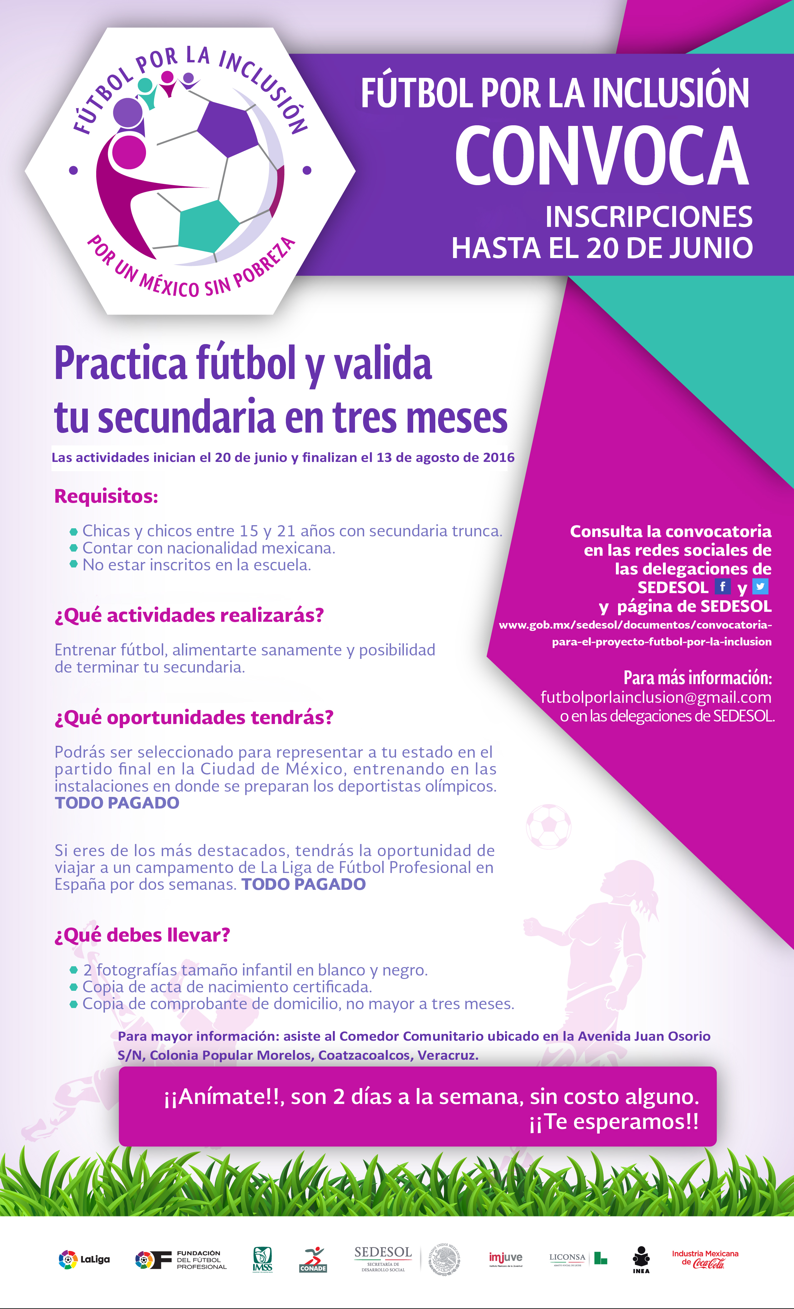 La Secretaría de Desarrollo Social invita a jóvenes de Coatzacoalcos, entre 15 y 21 años, con secundaria trunca y que les guste el balompié, a integrarse al programa “Futbol por la inclusión: por un México sin pobreza” -entrenarán futbol y podrán terminar la secundaria-.