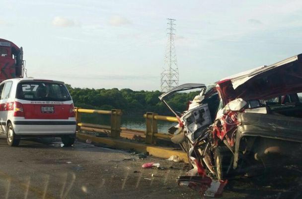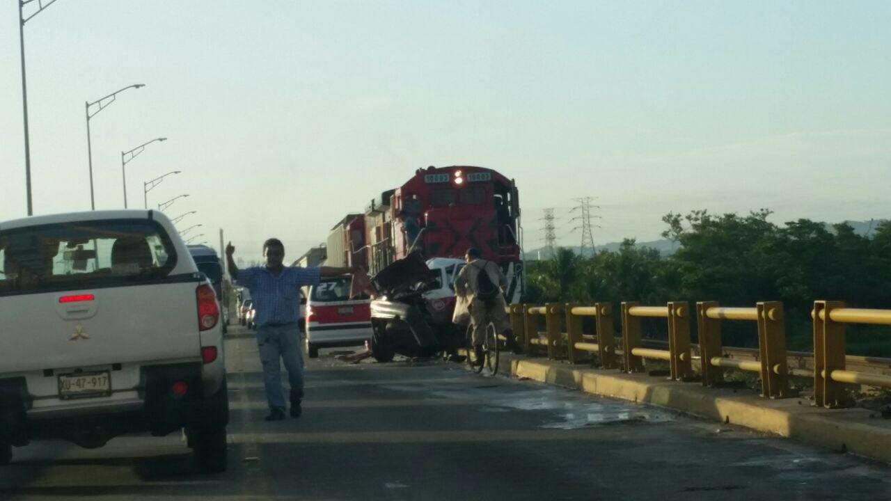 Un taxi quedó completamente destrozado esta mañana, al impactarse contra el muro de contención del Puente Coatzacoalcos 1.