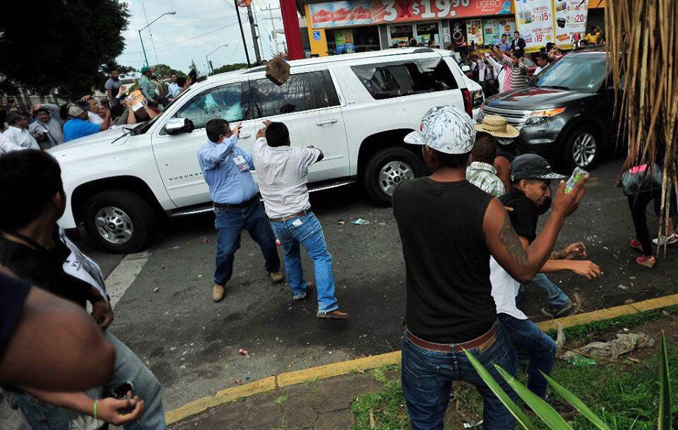 A su salida, Gobernador electo fue agredido por Los 400 Pueblos. Acusan que fueron enviados por Javier Duarte.