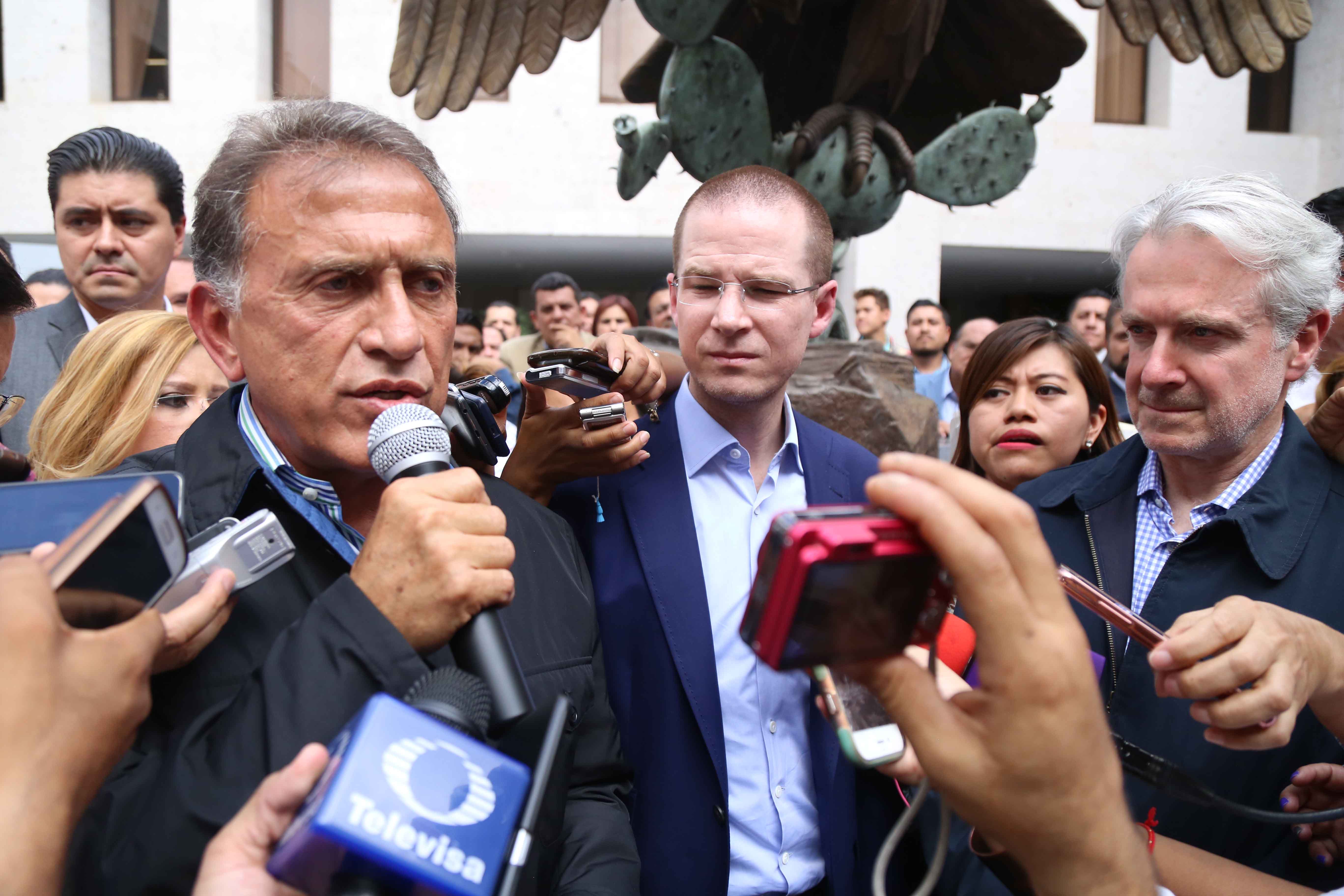 En rueda de prensa ofrecida, en la explanada del Congreso local por el gobernador electo, Miguel Ángel Yunes Linares en conjunto con el presidente del Partido Acción Nacional (PAN), Ricardo Anaya Cortés y el presidente de la Comisión de Procesos Electorales, Santiago Creel Miranda realizaron un llamado enérgico para evitar la aprobación del paquete de impunidad que está conformando el gobernador, Javier Duarte de Ochoa.
