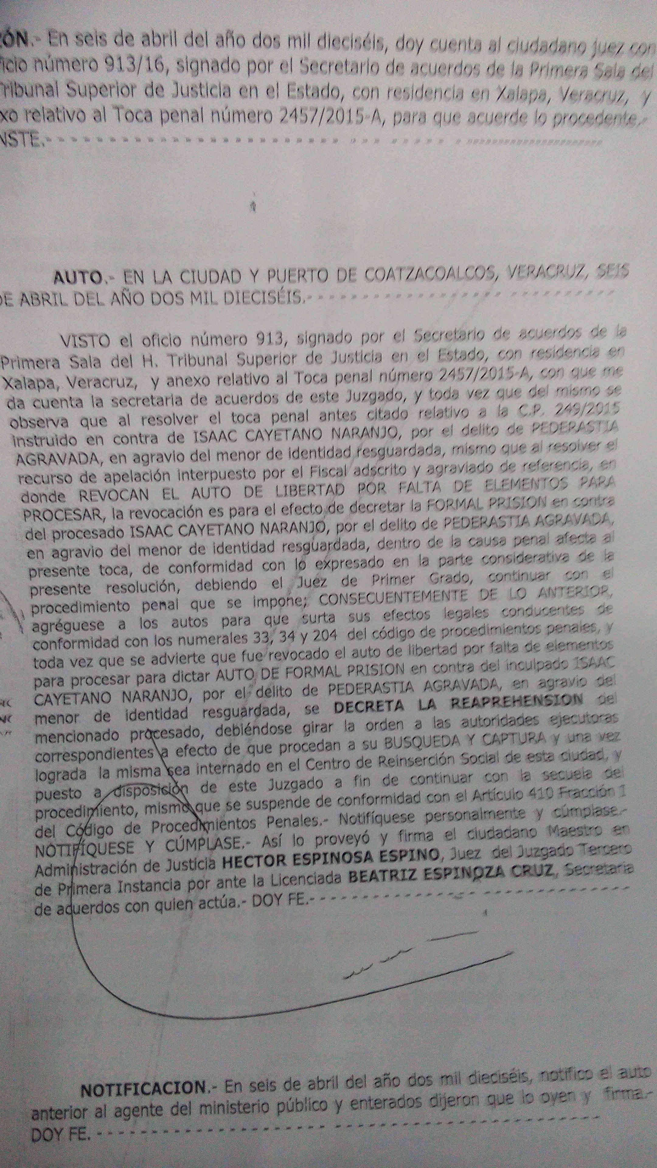 «Se dicta auto de formal prisión en contra de Isaac Cayetano Naranjo, como probable responsable del delito de pederastia con penalidad agravada cometido en agravio del menor de 8 años de edad, de identidad resguardada», así lo suscribieron los magistrados del Primera Sala del Tribunal Superior de Justicia del Estado.