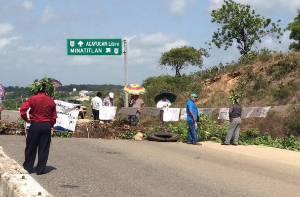 Cosoleacaque, Ver.– Con ramas de árboles y pancartas, con piedras, centenares de personas ligados al sector magisterial bloquearon la autopista Acayucan-Cosoleacaque a la altura de una agencia automotriz Diez, ubicada al sur de la entidad.
