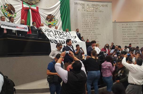 En tanto, en la Mesa Directiva se plantaron diputados del PAN, PRD, PT y Movimiento Ciudadano que con mantas gigantescas donde se leía: “Veracruz es tu jefe, Duarte no, hay que dar marcha atrás a esa iniciativa”.