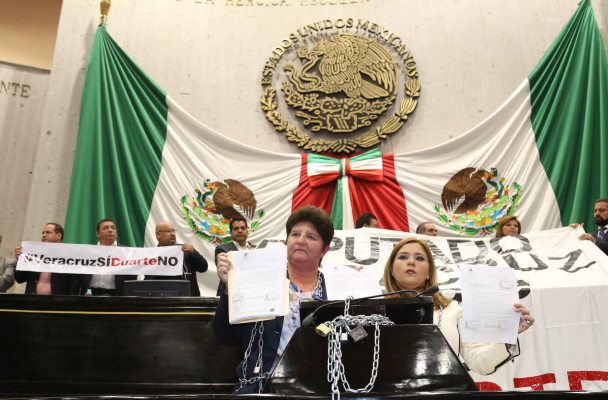 Previo al inicio de Sesión las legisladoras panistas, Ana Cristina Ledezma López y María del Carmen Pontón Villa se encadenaron a la tribuna, y en la Mesa Directiva se desplegó una manta con la leyenda: «Diputados, Veracruz es tu jefe, no Duarte», como mensaje a los diputados priístas y aliados.