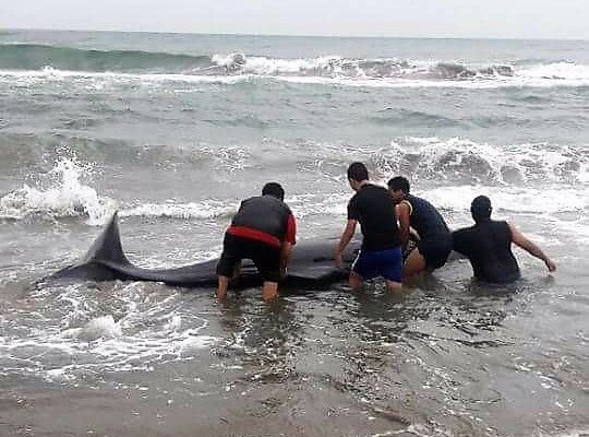 Vuelve a recalar en la playa el cachalote marino; y lo vuelven a regresar al mar
