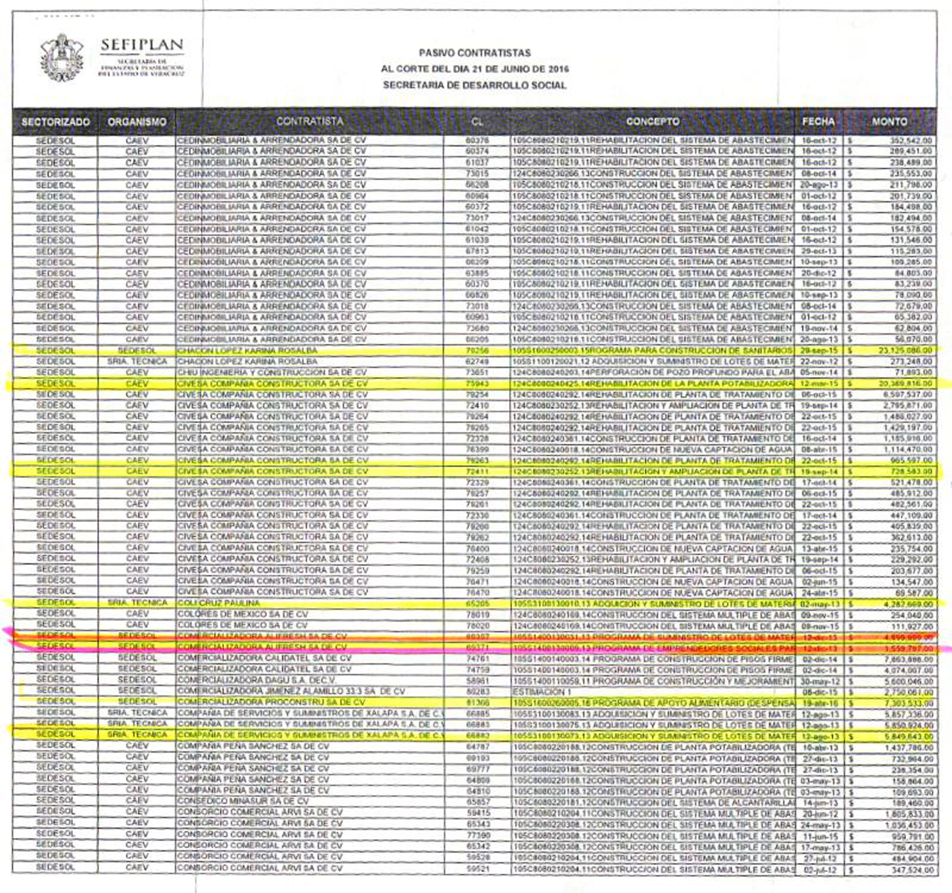 En tanto a la COMERCIALIZADORA ALIFRESH SA DE CV se le liquidaría 4 millones 999 mil ,999 pesos, y otra cantidad por un millón 558 mil 797 pesos así como a AD911 SA DE CV por 629 mil 893 pesos, todas por el concepto de un supuesto suministro de lotes de materiales a la Sedesol.