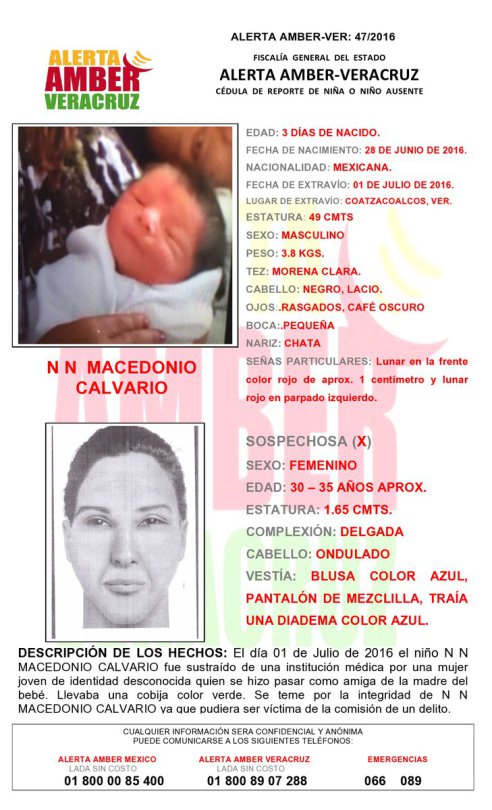 Durante la tarde de este jueves, elementos de la Policía Ministerial y de la Fuerza Civil en Coatzacoalcos acudieron a las oficinas del Registro Civil localizadas en el anexo del palacio municipal, después de que reportaran que a esa oficina llegó una mujer intentando registrar al menor, Daniel Macedonio Calvario, bebé que le fue robado a su madre en el Hospital Regional de esta ciudad.